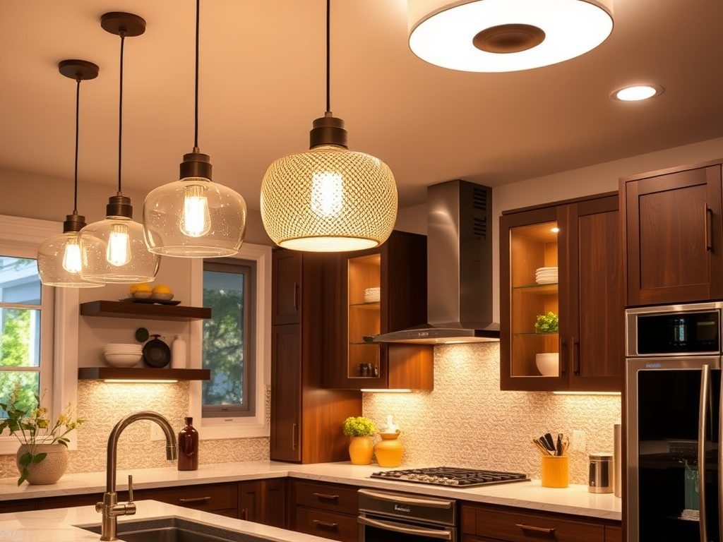 | Oświetlenie ogólne | Równo oświetla całą przestrzeń, zapewniając komfort i ergonomię. | Lampy sufitowe, plafony lub zwieszane lampy, idealne do głównego oświetlenia kuchni. |